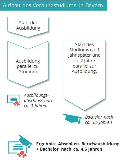 Merke: Ein Verbundstudium in Bayern ist ein duales Studium, das eine Berufsausbildung einschließt, die ein Jahr vor Studienbeginn angefangen wird.