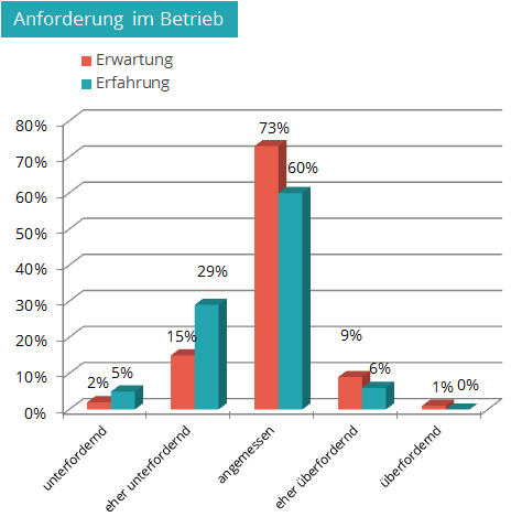 Überfordert fühlt sich kein Student – weder durch die theoretische noch durch die praktische Ausbildung. Im Gegenteil: Einige Studierende fühlen sich während der praktischen Ausbildung im Unternehmen eher unterfordert. Hier sieht man einen deutlichen Unterschied zu der Einschätzung, die Bewerber vor dem Start ins Studium geäußert haben. Grundsätzlich sieht man, dass ein duales Studium im Vorhinein als "härter" eingestuft wird, als es sich dann im Studienverlauf entpuppt. Ausnahmen gibt es natürlich immer, aber der Abbruch eines dualen Studiums findet tatsächlich eher selten statt.