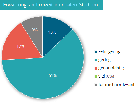 Diese Erwartungen spiegeln sich auch in den bereits gemachten Erfahrungen der Studienteilnehmer wider: Das duale Studium schränkt die Freizeit ein und ein typisches Studentenleben wird im dualen Studium vergeblich gesucht, berichten 72 Prozent bzw. 80 Prozent der Studienteilnehmer.