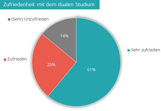 Ein Ergebnis, das sich sehen lassen kann. Denn obwohl die Befragten angeben, dass sie weder ein typisches Studentenleben noch übermäßig viel Zeit für die Freizeitgestaltung haben – für viele Studenten sonst ja überaus wichtig – ist die Zufriedenheitsrate ausgesprochen hoch. Lediglich 14 Prozent der Befragten sind unzufrieden mit ihrem dualen Studium.